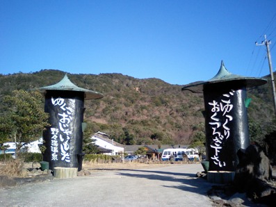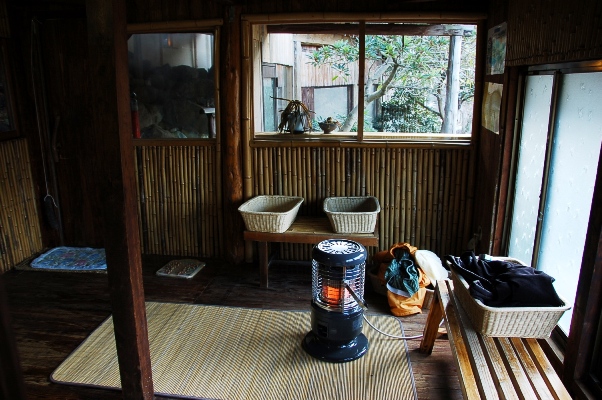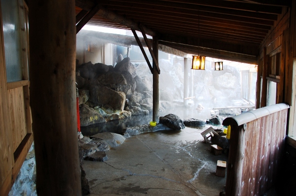 さて、テントを設営したら温泉に入りましょう。冬場には脱衣所にガスストーブが炊いてあります。お風呂は半露天とでもいう感じで、ここもまた手作り感あふれています。さきほどの蒸し釜に利用されているのと同様、温泉の蒸気を利用したサウナが設置されているので好きな方は蒸し豚になるのもいいでしょう。 残念ながら温泉からの眺望がすばらしいとは言えませんし、当然女性風呂を覗くこともできません!ただし女性風呂からは男性風呂は丸見えです(笑)