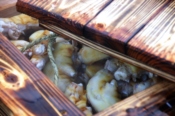 その蒸し場・調理場は上段フリーサイトから石階段を降りたところにあります。この温泉の特徴のひとつで、蒸し釜が設えてあります。もちろん自由に使うことができます。野菜はもちろん鶏肉、卵、魚など食材を持ってきて蒸せば最高ですね。蒸すためのカゴなどは、その辺りを探せば、どこかに隠してあります(笑)